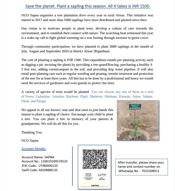 Much before the launch of the Trillion Tree Campaign at the 2020 World Economic Forum in Davos, SAPNA promoted biodiversity near its project-site in Alwar by planting 5000 different